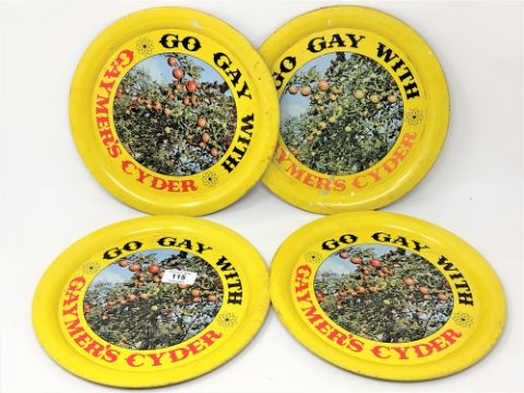 A set of four cirular tin pub trays : GO GAY WITH GAYMER'S CIDER, diameter 26 cm. (4)