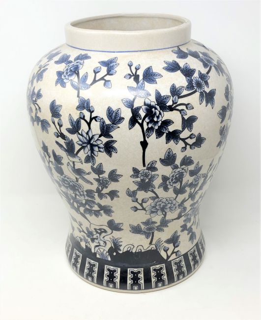 A decorative blue & white glazed ware pot, with blossom bough decoration, by India Jane of London, height 38 cm.