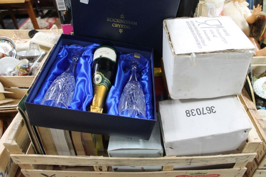 A box of Rockingham crystal champagne set, books and accessories etc