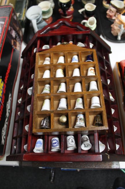 Four wooden thimble racks and thimbles