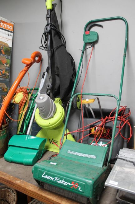 An electric lawn raker together with garden vac, strimmer, tool box etc