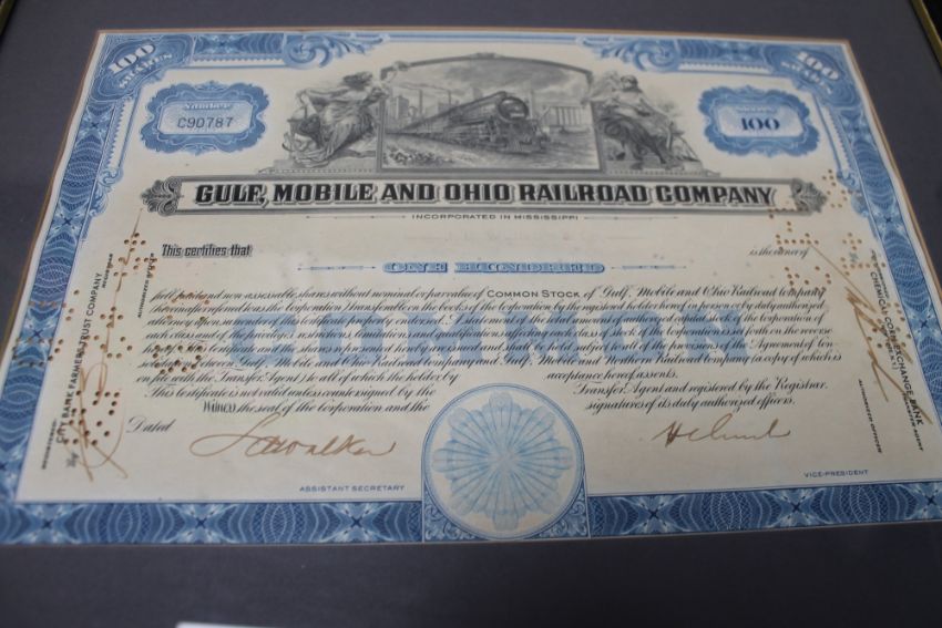 Two framed share certificates - The Gulf Mobile and Ohio railroad company and a further 19th century certificate
