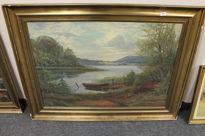 Continental school, oil on canvas, boats moored on a lake