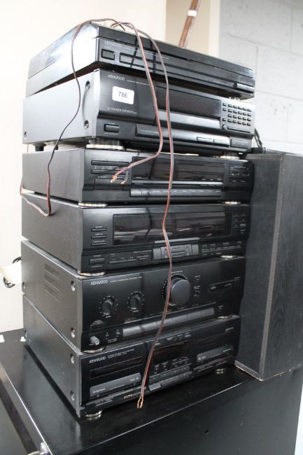 A Kenwood six piece stereo, pair of speakers and remote & waalking stick.