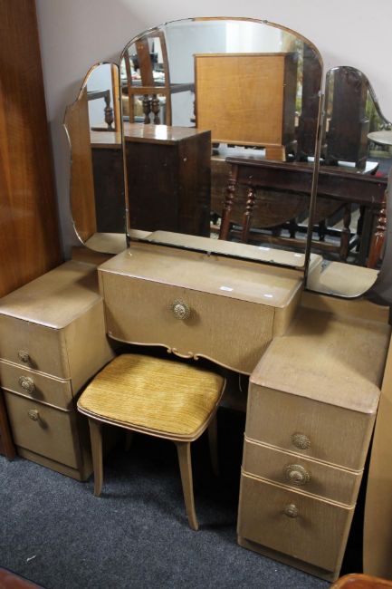 An early twentieth century mirrored dressing table with stool and matching 3/4 size bed with interior metal frame