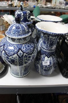 Six items of blue and white Delft ware including lidded urns, two pairs of vases