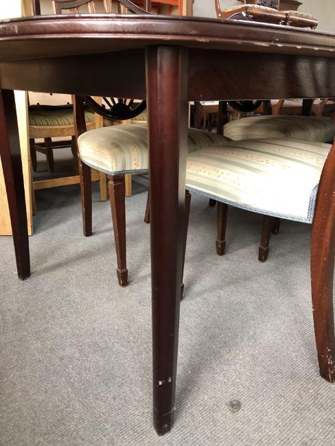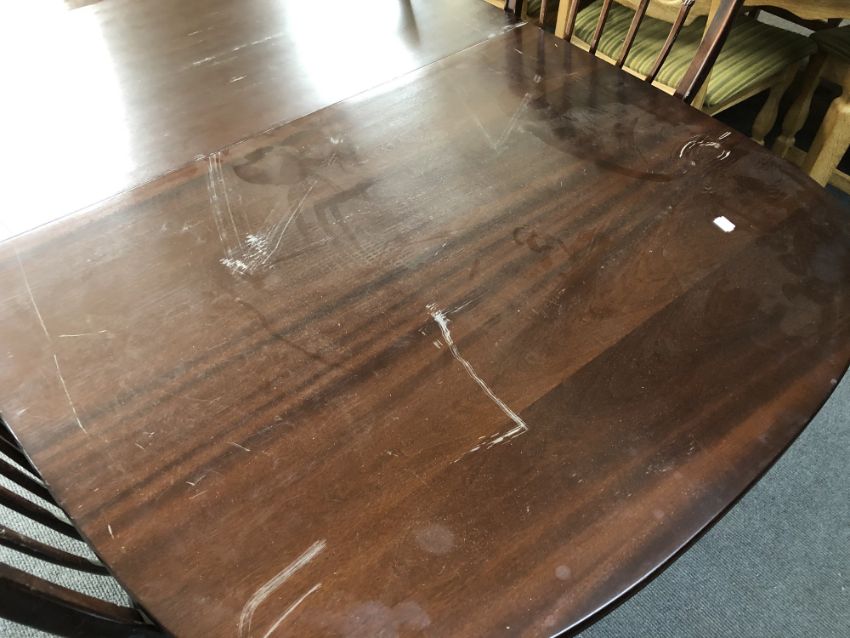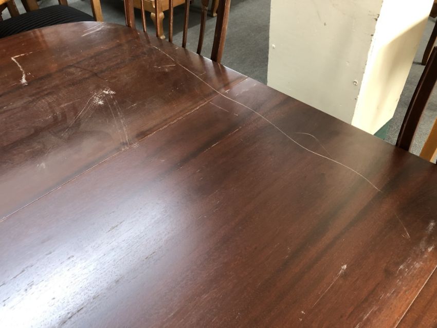 This is veneered, not solid wood. It is 205cm long and 98cm wide. Numerous scuffs and scratches to finish, see images.