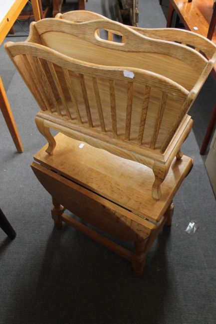 A light oak mag rack and a flap sided coffee table.