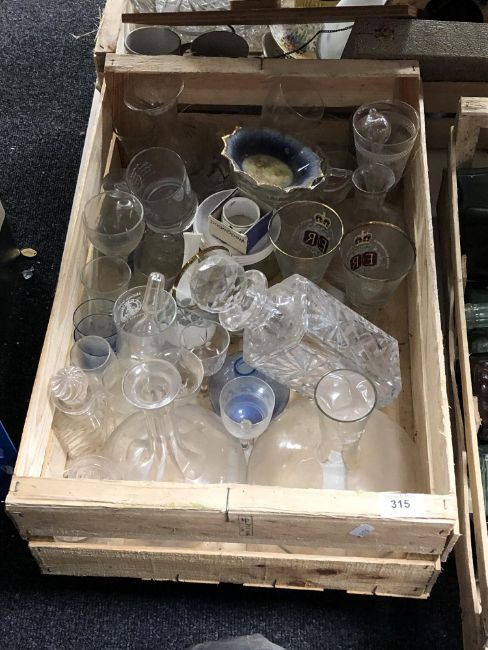 A crate of glass decanters, glass etc
