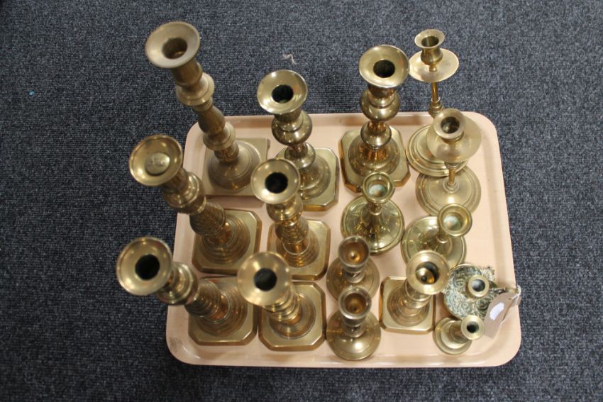 A tray of antique and later brass candlesticks