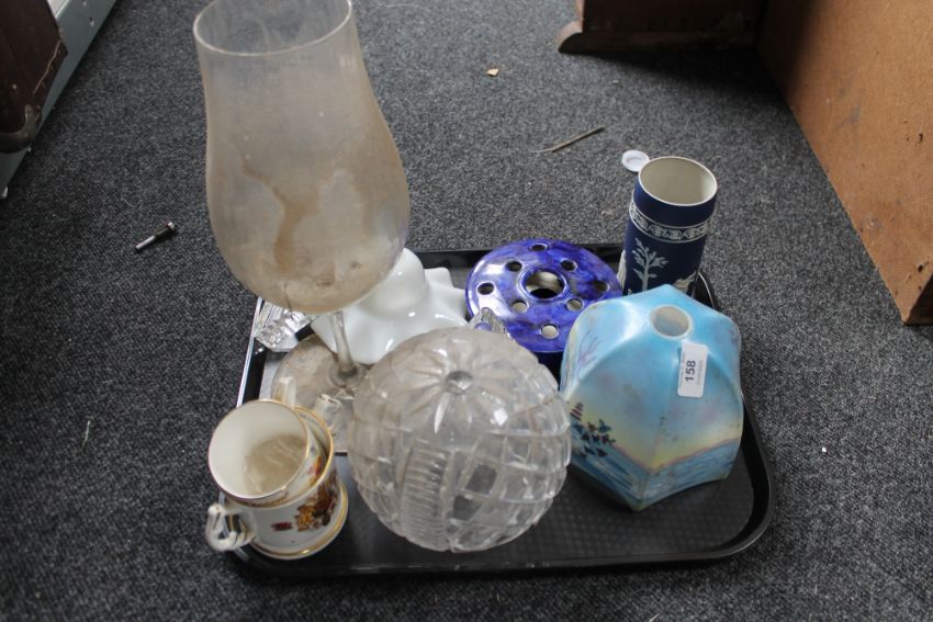 A tray of Wedgwood vase, glass light shade, large glass vase etc