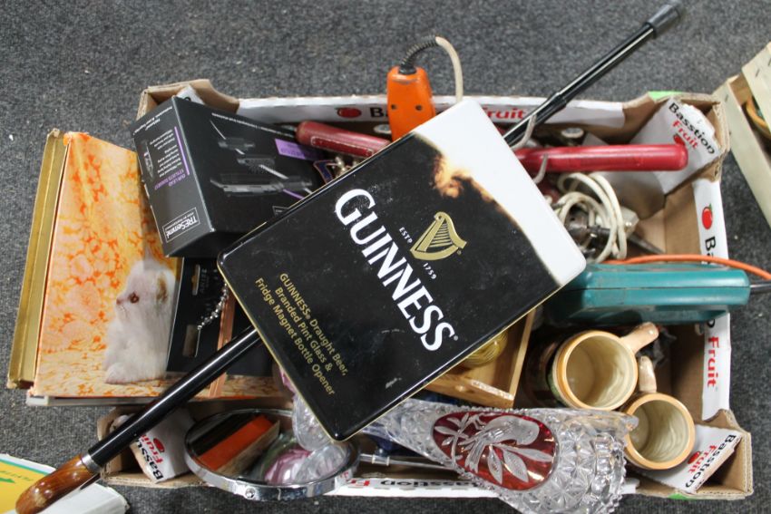 A crate of hand tools, crystal vase, costume jewellery etc