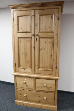 A pine double door wardrobe with three drawer chest in base, width 100 cm, depth 60 cm and height 210 cm.