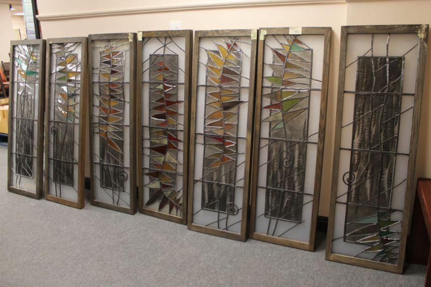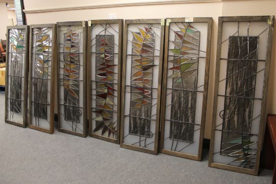 A series of seven stained glass wooden framed panels with abstract leaf design, each panel 45 cm x 141 cm. (7)