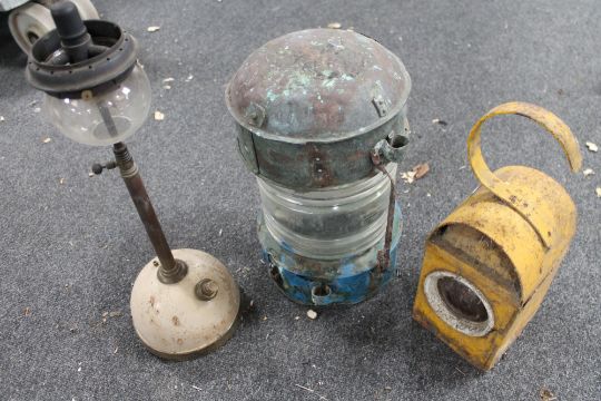 Two twentieth century railway lamps together with a copper topped light and paraffin lamp