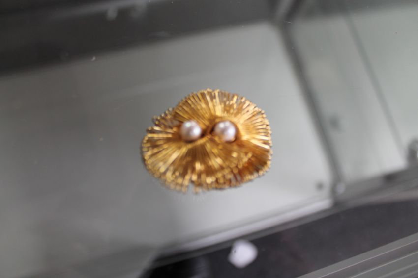 A yellow metal brooch set with two pearls.