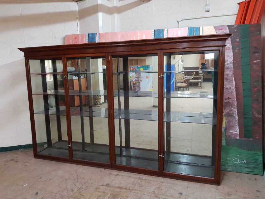 A Victorian mahogany four door shop display cabinet with mirrored panel back, height 173 cm x width 285 cm x depth 41 cm.