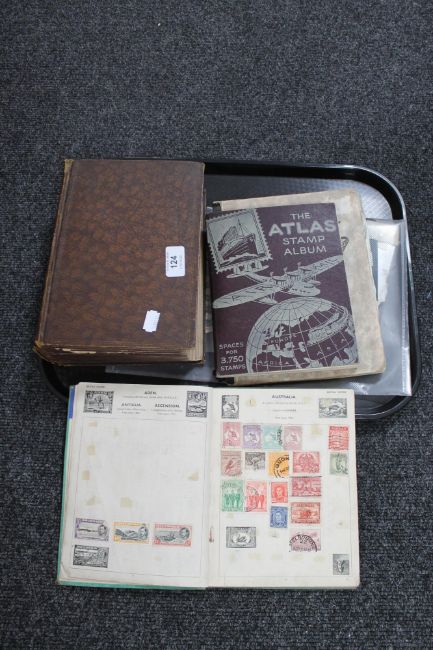 A tray of stamp albums, ephemera, dictionary etc