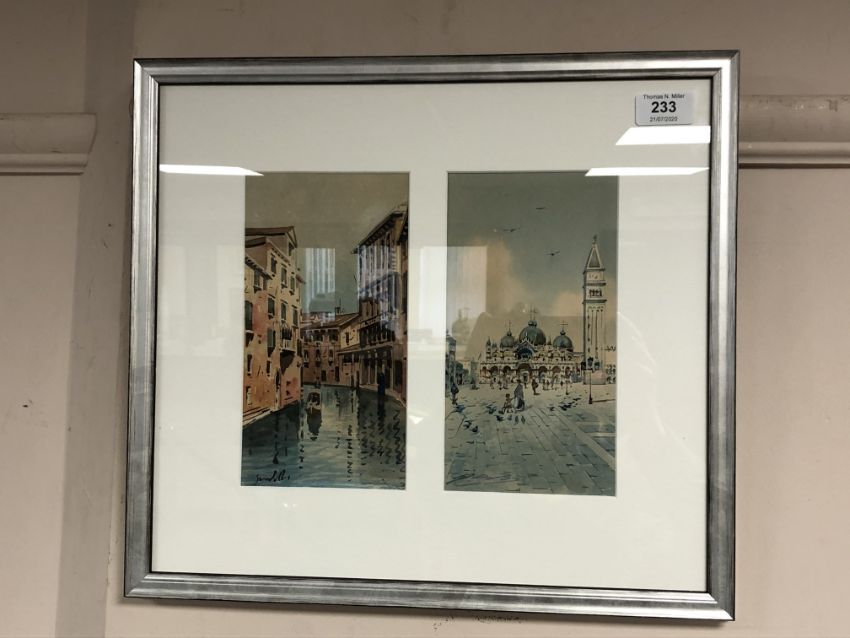 Early 20'th Century Continental School : Venetian Studies, two watercolours, each indistinctly signed, each 21 cm x 11 cm, framed overall as one.