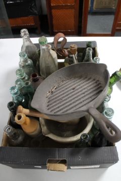 A crate of antique and later glass bottles, pestal and mortar, iron griddle pan etc