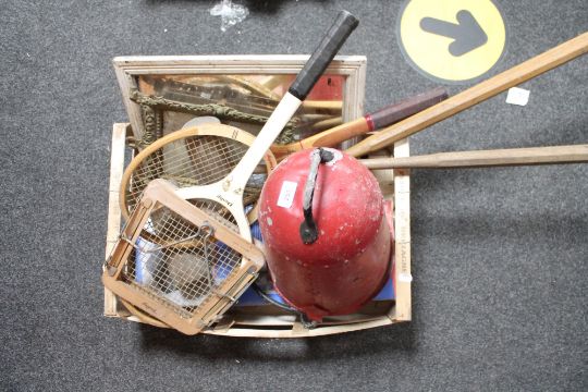 A box of fire bucket, rackets, two mirrors, two mallets