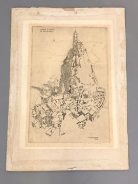 A Tom Gentleman monochrome etching, Rocher St. Michel, unframed