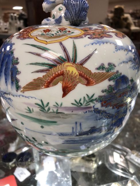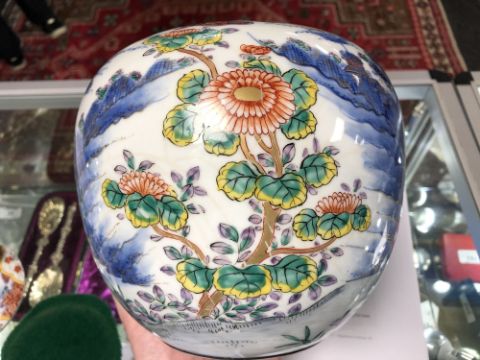 A Chinese porcelain ginger jar, the lid with surmounted foo dog, painted and gilt with traditional scenes, height 23cm.