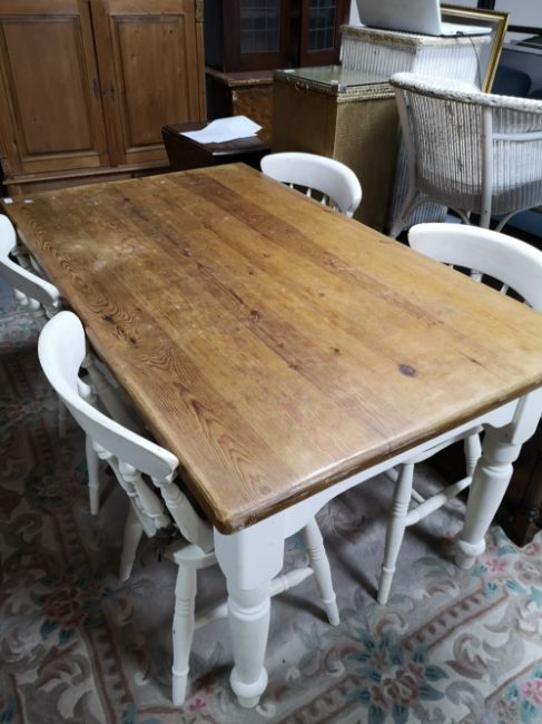 A rustic pine farmhouse table and four painted chairs