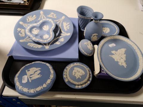 A tray of Wedgwood blue and white jasper ware china