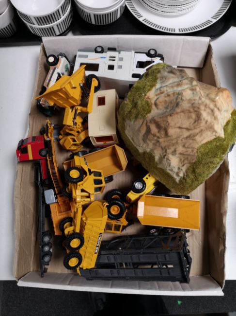 A box of die cast toys, dumper truck etc