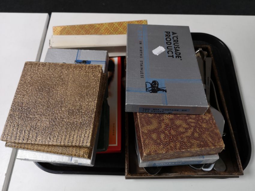 A tray of stainless steel and other cutlery, boxed Firth stainless steel etc