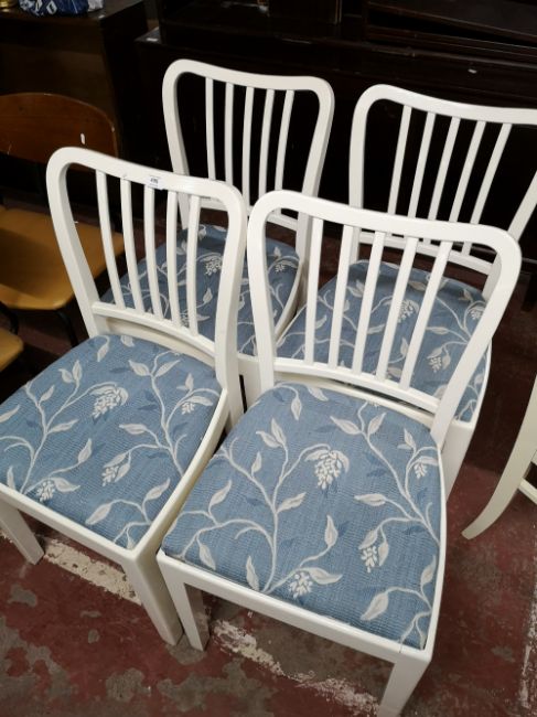 Four painted white dining chairs with seats in floral fabric.