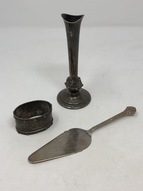 Three pieces of Lindisfarne silver; vase, napkin ring and cake slice
