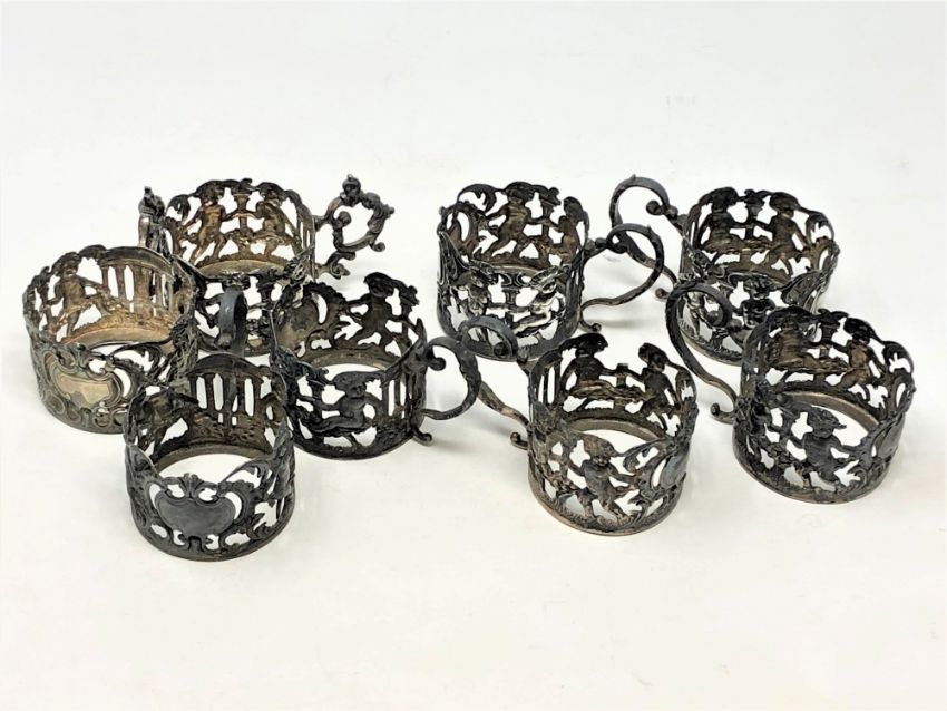 A set of eight ornate Victorian silver cup holders decorated with putti