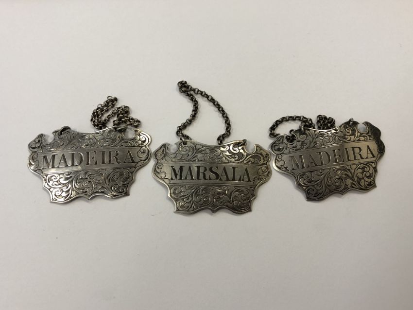 A set of three Victorian silver decanter labels, two Madeira and one Marsala, by George Unite
