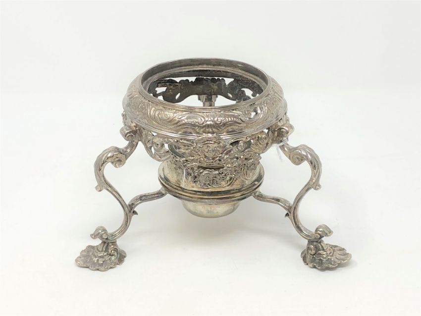 An early 18th century ornate silver kettle stand with burner, height 13cm.