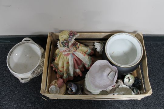 A large ceramic figure of a child holding an apple together with an Adams ware urn etc