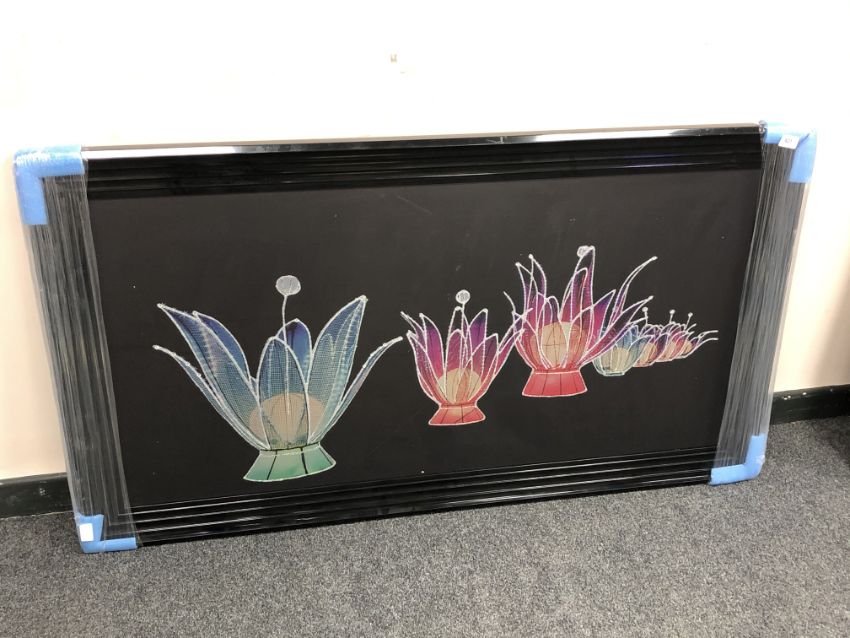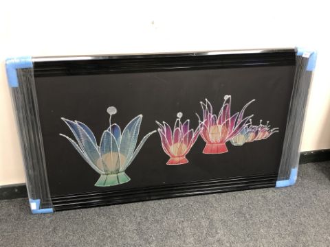 A floral picture in a black frame depicting flowers