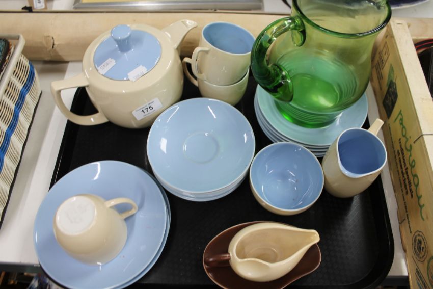 A tray of Branksom china, green glass jug, Carlton ware sauce boat
