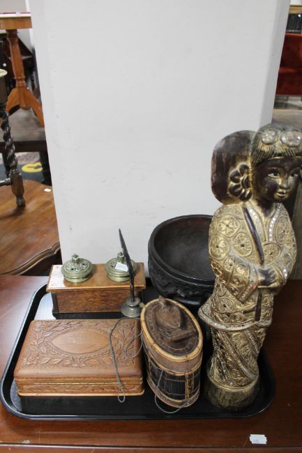An eastern carved treen bowl together with an oriental carved figure, desk stand etc