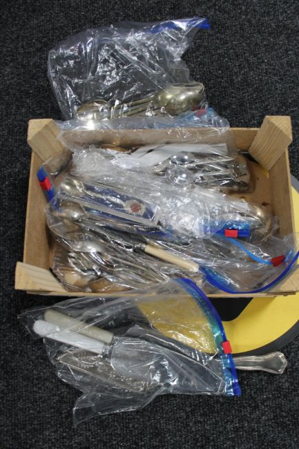 A basket of silver plated cutlery etc