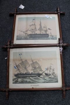 A pair of colour prints of tall ships in Edwardian frames