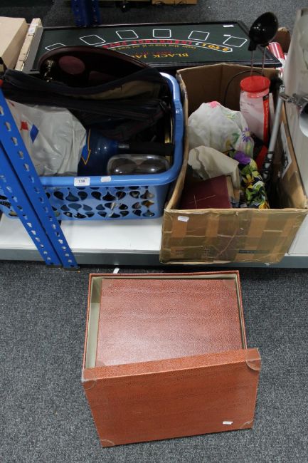 A plastic storage crate of sundries, cds, bags, storage boxes etc
