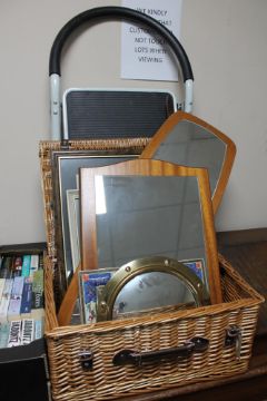 A wicker crate of teak framed mirrors, pictures and prints, metal step