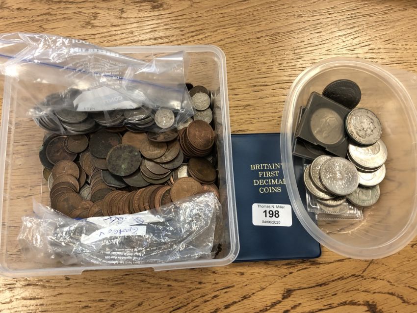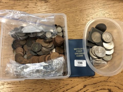 Two tubs of Victorian and later English coins, shillings and six pences, 20th century crowns, Decimal coin set etc