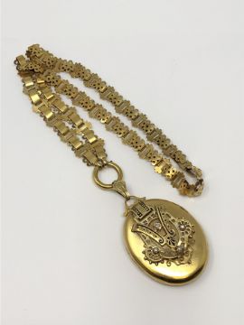 An antique yellow metal pearl and diamond locket and necklace, 38.1g.