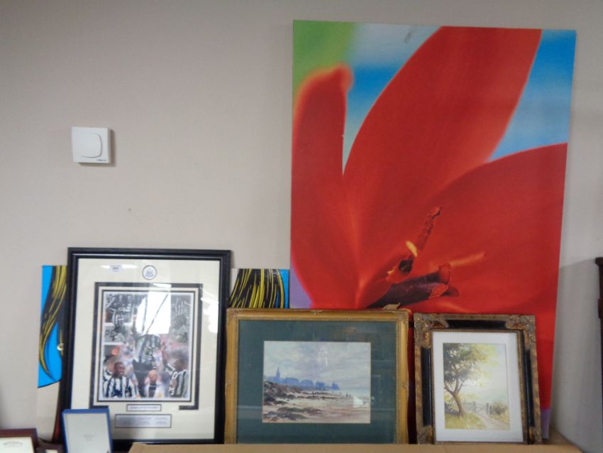A gilt framed Tom Mcardle print - Tynemouth beach, together with a Newcastle United no.9 shirt montage, further print and pop art picture