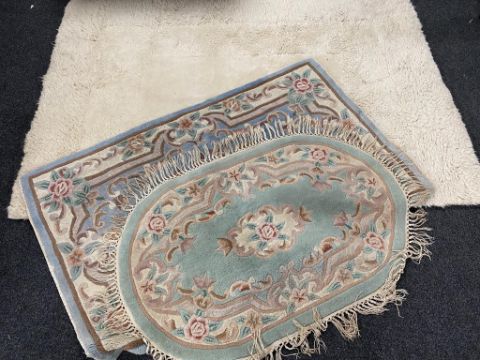 A cream woolen rug together with two fringed Chinese rugs