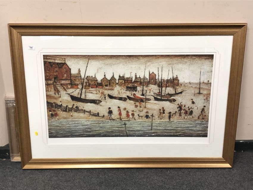 After Laurence Stephen Lowry RA (1887-1976), The Beach, colour print, limited edition, 96 cm by 50 cm, produced by Chelsea Green Editions, with certificate of authenticity.