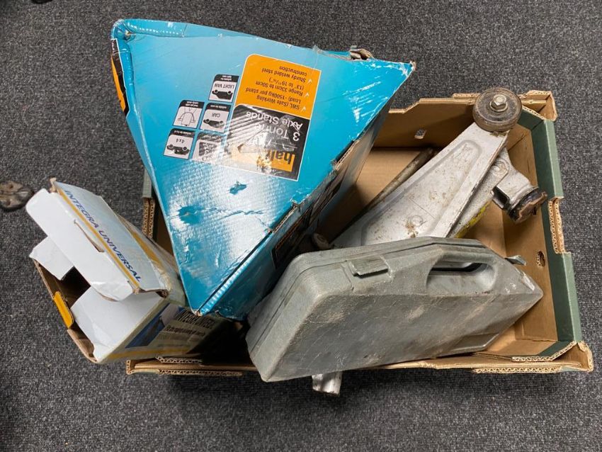 A box of trolley jack, socket sets, axle stands etc
